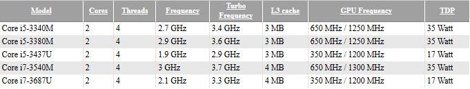 酷睿i7-3540M处理器的主频为3/3.7GHz,配置4MB缓存而不是上述处理器的3MB缓存,集成一个650/1,300 MHz图形处理器。热设计功率为35瓦。
