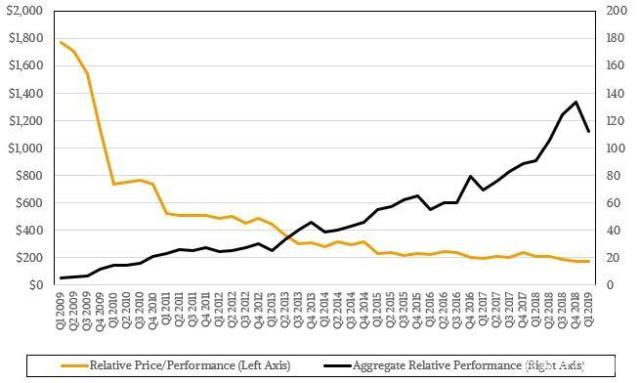 这张图表的还表明,服务器价格/性能的相对价格在2009年和2011年之间大幅下降,但随后下降幅度减小,因为英特尔在数据中心拥有霸主地位。当然,英特尔正在产品中增加支持更多整数,提升内存速度以实现平衡,闪存正在取代磁盘,并且矢量引擎性能增长得更快,整数性能成本和三年前大致相同。整体看,这比大萧条时便宜了一个数量级。