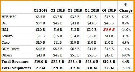值得一提的是,IBM这次没有进入前五大供应商,因为它的System z14升级周期已经逐渐过去,即使Power Systems业务有所增长。将X86服务器业务卖给联想确实无助于IBM提升盈利能力。IBM仍然没有像我们认为的那样在系统中赚到那么多钱,并且,当竞争激烈时,价格下降将使利润下降得更快。