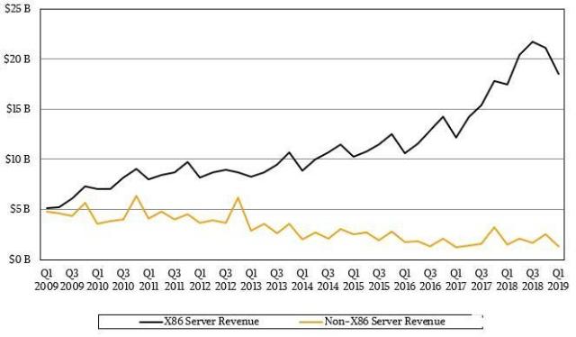 大衰退对整个产业带来了很多影响,其中之一就是它将所有非x86处理器降级为利基状态。RISC / Unix供应商无法提供与英特尔Xeon处理器加上Linux或Windows Server操作系统运行虚拟化堆栈匹敌的性能。与此同时,随着在线应用程序和云计算变得流行,超大规模和云构建商的计算容量需求也有一个数量级的增长。因此,英特尔每个季度销售在不断上升,即使核心数量和每个时钟周期的指令在不断增加,这是处理器常规的升级。