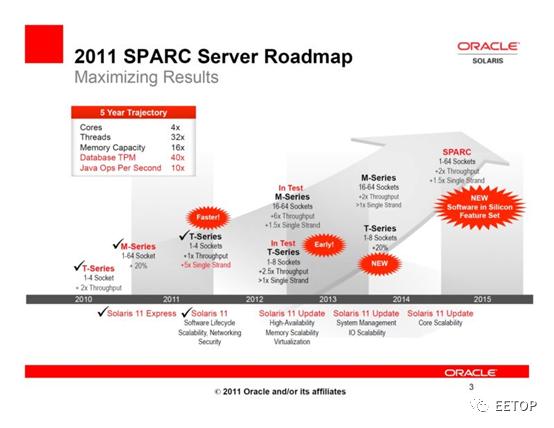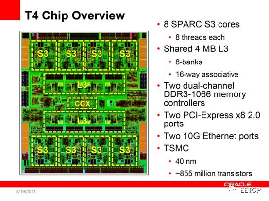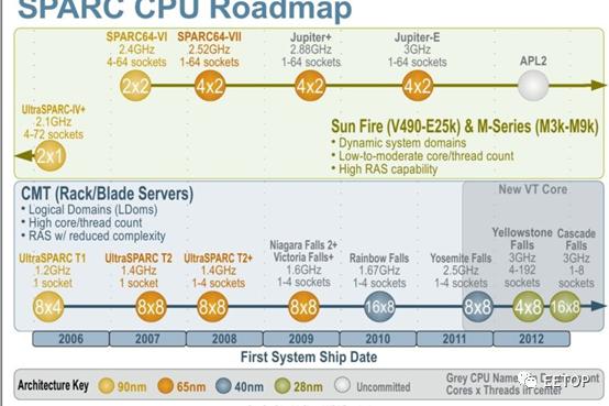 - 2011 年的SPARC T4:40纳米制程,时钟2.85~3GHz,8核64线程。