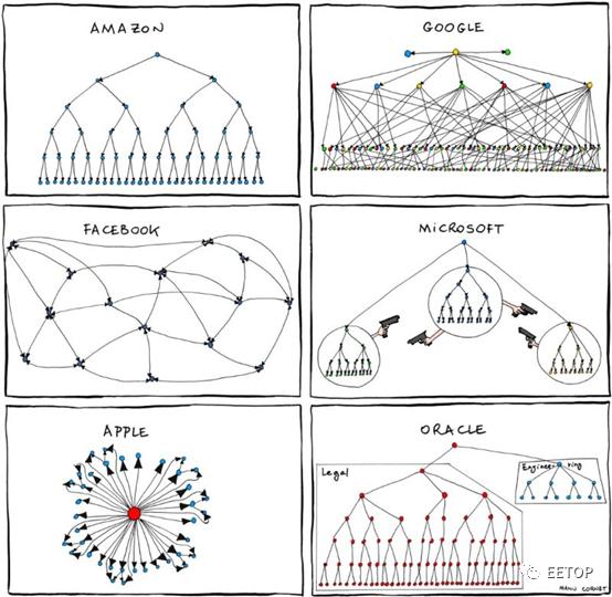 法国漫画家Manu 曾在2010 年,画了好几张「奇葩组织图」一次调侃苹果、Google、Oracle、微软、Facebook、亚马逊这6 家超级公司,Oracle 这张似乎冥冥之中预言了Sun 的命运。