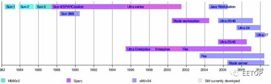 软硬兼备的Sun,在1980 年代工作站市场、1990 年代的服务器市场,均获得极重大的成功,这从处理器业界效能指标SPEC CPU 的参考基准,即可略见一斑:SPEC CPU 95 是SuperSPARC ,SPEC CPU 2000 是UltraSPARC I,SPEC CPU 2006 则是时钟296MHz 的UltraSPARC II。值得一提的是,有别于IBM、Intel、AMD 和DEC,Sun 没有自建晶圆厂,自行研发的SPARC 处理器均交由TI 代工制造,被Oracle 购并后转向台积电。