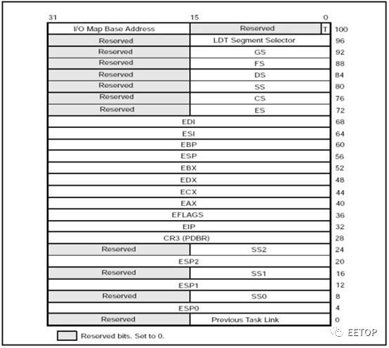 当处理器碰到中断(如外部I/O 呼叫)、例外(像算术溢位)、进程切换,须将当前的执行状态,包含所有可存取的寄存器,都以事先定义好的数据结构回存到存储器,如x86 指令集的TSS(TaskStatus Segment),当恢复先前状态,再从存储器载回处理器。