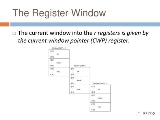 Register Window 藉由「重叠」不同程序使用的寄存器,即可交换不同程序的数据,但「软件眼中随时可见」的寄存器数量仍为32 个,8 个全域(Global),剩下24个当作Register Window,8 个输入(In)、8 个区域(Local)、8 个输出(Out),逻辑上可视为一个巨大堆叠,Register Window 指标器(CWP)一次移动16 个寄存器的距离,前一个程序的输出变成下一个程序的输入,当程序切换时,无须将专属于特定程序的8 个区域寄存器搬到存储器,也减少了寄存器和存储器之间的数据搬移量。