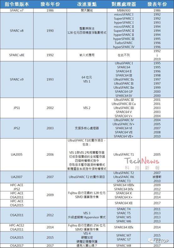 1995 年SPARC v9 扩充到64 位元与SIMD 指令集VIS(Visual Instruction Set),Sun 跟Fujitsu 在2002 年联合提出JPS(Joint Programming Specification)规范并持续演进到UA(UltraSPARC Architecture)、OSA(Oracle SPARC Architecture )和Fujitsu 自行定义的高效能运算HPC-ACE(High Performance Computing – Arithmetic Computational Extensions)。