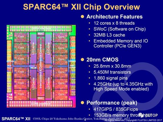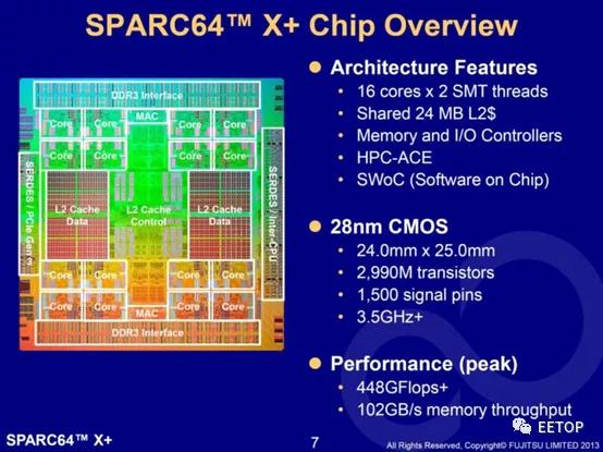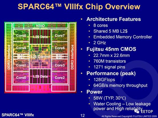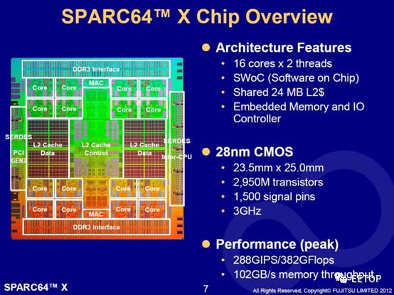 - 2012 年的SPARC64 X:28纳米制程,时钟3GHz,16核心32线程,耗电量冲上270W,存储器控制器也「搬家」到处理器内部了。