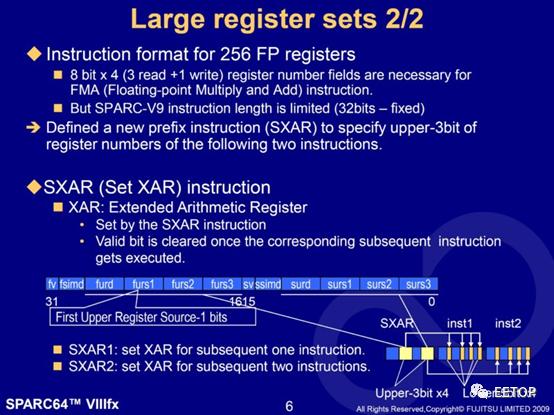 因为SPARC v9 指令集的编码位元,不足以定址所有的浮点寄存器,256 个寄存器需要8 位元,浮点乘积和(FMA,A×B+C=D)指令会用到4 个寄存器,将会吃光32 位元编码,连运算码都没地方放了,须在运算指令前,排入「补充」寄存器定址位元数的前置指令(SXAR)。