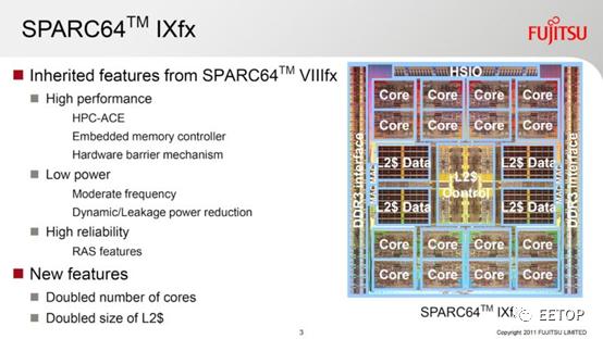 - 2011 年的SPARC64 IXfx:40纳米制程,时钟2.85GHz,16核心,配合PRIMEHPC FX10超级电脑而同步发表。总之,只要看到名称内有那个小写的fx就知道这是超级电脑特规版了。