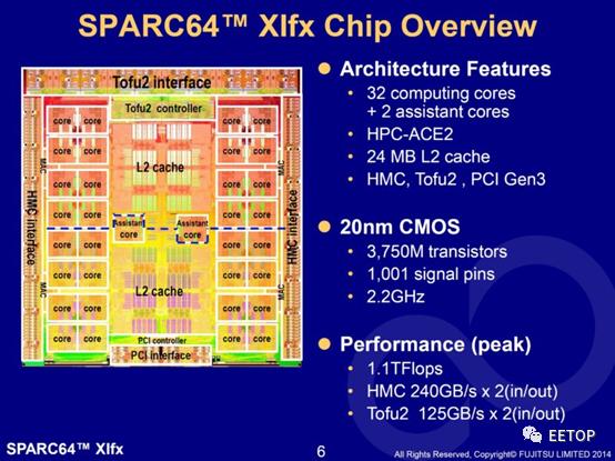 2014 年的SPARC64 XIfx:台积电20纳米制程,时钟2GHz,34核心(32个运算加2个辅助),新增HPC-ACE2指令集。高度整合存储器控制器与汇流排界面的SPARC64 XIfx堪称SPARC世界第一颗超级电脑系统单芯片。