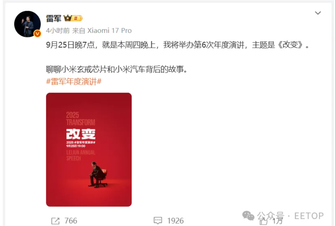 雷军今天发布微博:“9月25日晚7点,就是本周四晚上,我将举办第6次年度演讲,主题是《改变》。聊聊小米玄戒芯片和小米汽车背后的故事。”