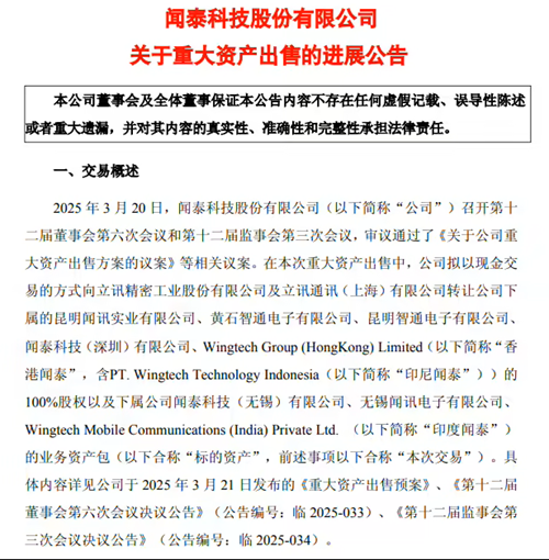 12月9日消息,闻泰科技发布《关于重大资产出售的进展公告》,披露了其向立讯精密及其关联公司转让多项资产的最新进展情况。据悉,此次重大