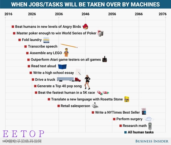 至于那些更复杂和更具创造性的任务,例如写书和进行高等数学运算,则需要更长时间。最终,研究人员发现,到 2061 年,人工智能将可完成所有人类任务,到 2136 年将取代所有人类职位。