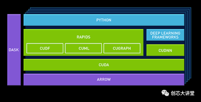 英伟达还添加了一个柱状内存数据库Apache Arrow。这是因为GPU在向量上运行,因此有利于内存中的柱状布局。