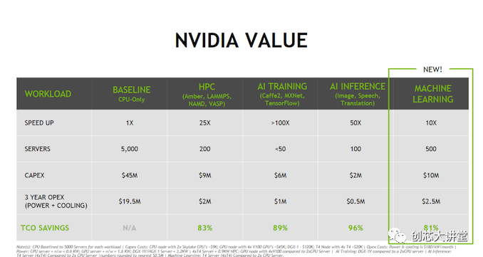 英伟达的整个商业模式围绕着这样一个理论:购买昂贵的硬件,如DGXs和特斯拉,对你的TCO有好处(“买得越多,省得越多”)。不要购买5000台服务器,而是购买50台DGX。尽管DGX消耗的功率增加了5倍,而且耗资12万美元而不是9,000美元,但你的状况会好得多。当然,这是最好的营销方式,也可能是最差的营销方式,这取决于你如何看待它。但即使这些数字略有夸大,这也是一个强有力的信息:“从我们的深度学习的大本营到英特尔当前的增长市场(推论、高性能计算和机器学习),我们将以巨大优势击败英特尔。”