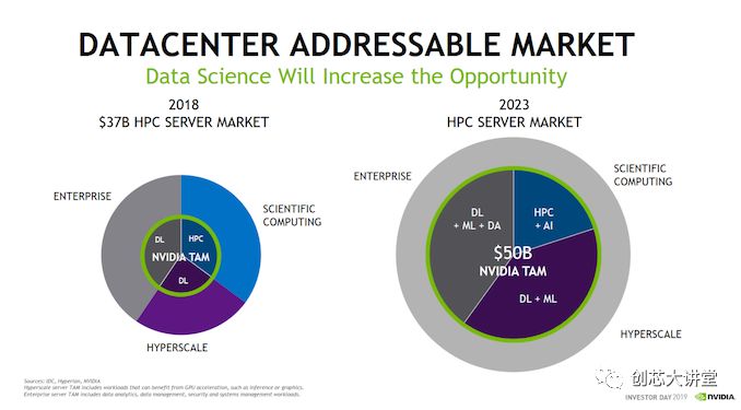 目前,在总计1000亿美元的市场中,计算密集型或高性能子市场约为370亿美元。英伟达认为,这个子市场将在2023年翻一番,他们将能够解决500亿美元的问题。换句话说,从广义上讲,数据分析市场将几乎占整个服务器市场的一半。