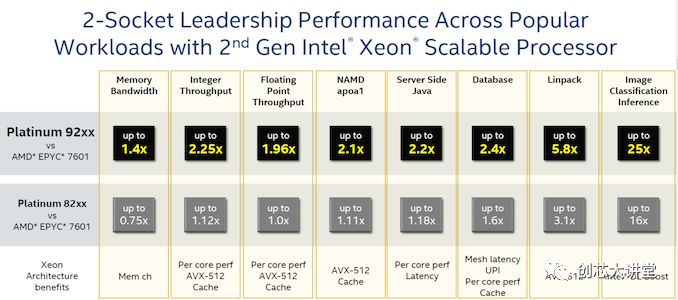 这张以“领先表现”为卖点的PPT还很方便地描述了英特尔在哪些市场处于非常脆弱的地位,尽管英特尔目前在数据中心占据主导地位。虽然PPT的重点是英特尔Xeon 9200,这可能是一个很容易为高端铂金8200 Xeons的PPT。