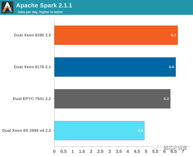 由于我们不知道的原因,我们可以让我们的2.7 GHz 8280比2.1 GHz Xeon 8176 表现更好。我们怀疑我们使用新的Xeon芯片与旧的(Skylake-SP)服务器的事实可能是原因,尝试不同的Spark配置(执行程序,JVM设置)没有帮助。BIOS更新对我们也没有帮助。