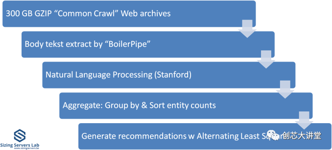 该测试在上图中描述。我们首先从从CommonCrawl收集的300 GB压缩数据开始。这些压缩文件是大量的Web存档。我们在运行中解压缩数据以避免长时间的等待,这主要与存储相关。然后,我们使用Java库“BoilerPipe”从存档中提取有意义的文本数据。使用Stanford CoreNLP自然语言处理工具包,我们从文本中提取实体(“含义词”),然后计算这些实体中出现次数最多的URL。然后使用交替最小二乘算法来推荐哪些URL对于某个主题最有趣。