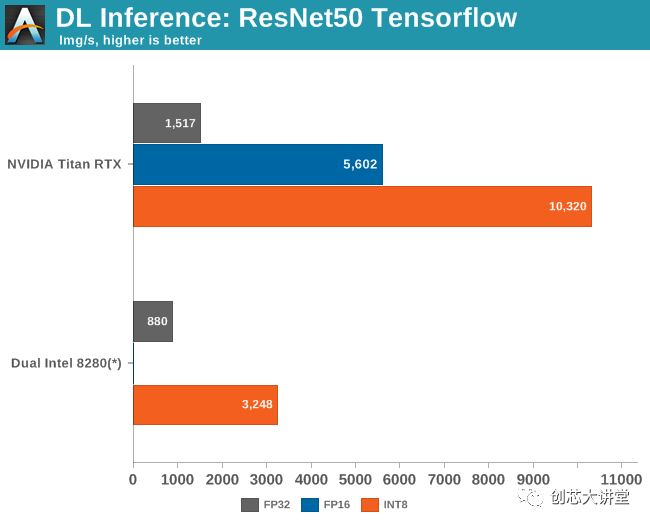 一旦我们启用INT8,2500美元的Titan RTX速度不会低于一对价值10万 美元的Xeon 8280。