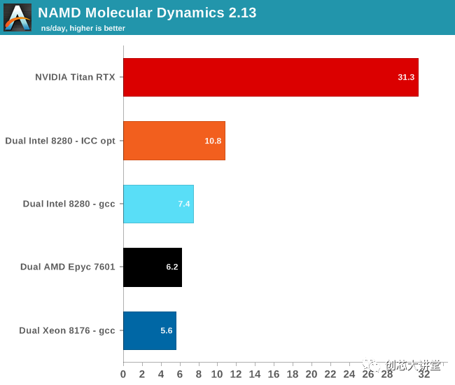 使用AVX-512可将此基准测试的性能提升46%。但同样,这款软件在GPU上的运行速度要快得多,这当然是可以理解的。至多,Xeon有28个内核,运行频率为2.3 GHz。每个循环可以完成32次单精度浮动操作。总而言之,Xeon可以做2个TFLOP(2.3 G * 28 * 32)。所以双Xeon设置最多可以完成4个TFLOP。泰坦RTX,在另一方面,可以做 16TFLOP 小号,或4倍之多。最终结果是,NAMD在Titan上的运行速度比双Intel Xeon快3倍。
