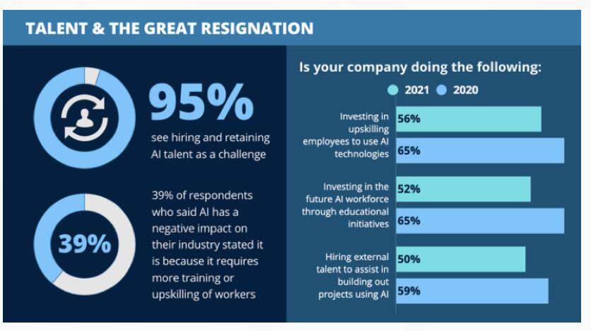 劳动力发展给本已资源匮乏的公司带来了压力。事实上,在表示人工智能对其行业产生负面影响的受访者中,有 39% 表示这是因为它需要对工人进行更多培训或提高技能。