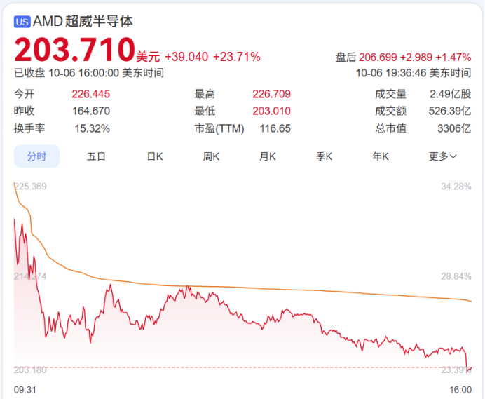昨日,AMD 与 OpenAI 宣布达成6 吉瓦(GW)算力合作协议,将通过多代 AMD Instinct GPU 为 OpenAI 的下一代人工智能基础设施提供算力支持。首阶段 1 吉瓦规模的 AMD Instinct MI450 GPU 部署计划于 2026 年下半年启动。据估算,该交易规模高达数百亿美元,大幅超出市场预期,迅速点燃投资者热情。受此消息推动,AMD 美股当日开盘暴涨超 34%,尽管收盘时涨幅收窄,但仍以超 23% 的涨幅报收。