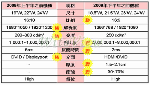 随着白光LED的应用逐渐推广至背光模块,2009下半年推出的LED机种主打影音娱乐的16:9比例,在分辨率与亮度上虽然没有过去规格高,但却大幅度提升对比度及反应时间,并诉求机身超薄化及环保节能的特色,来夺取市场焦点。