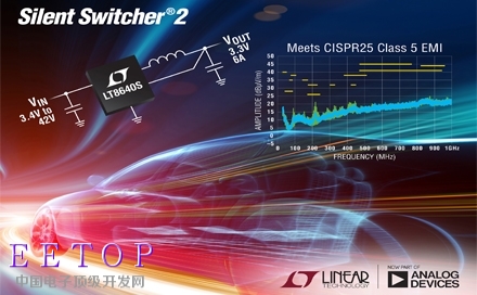 不久前收购了凌力尔特公司 (Linear Technology Corporation) 的亚德诺半导体 (Analog Devices, Inc.,简称ADI) 宣布推出 6A、42V 输入同步降压型开关稳压器LT8640S。其独特的 Silent Switcher® 2 架构采用两个内部输入电容器以及内部 BST 和 INTVCC电容器,以最大限度减小热环路面积。结合非常良好受控的开关边沿和一种具有整体接地平面的内部构造,并采用铜柱代替了接合线,LT8640S 的设计大幅度地降低了 EMI / EMC 辐射。这种改善的 EMI / EMC 性能不容易受到电路板布局的影响,从而简化了设计和降低了风险,即使在使用两层 PC 板时也不例外。LT8640S 在其整个负载范围内采用一个 2MHz 开关频率,能够轻松地满足汽车 CISPR25 Class 5 峰值 EMI 限制要求。另外,还可使用扩展频谱频率调制以进一步降低 EMI / EMC 辐射水平。