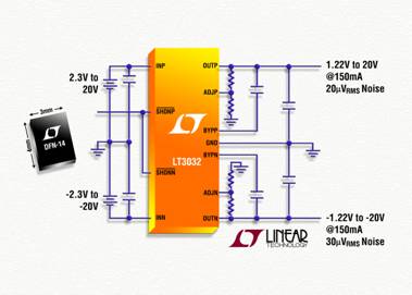 2010-03-03 14:58:38 本站原创Linear推出双输出、低噪声、正/负低压差电压线性稳压器 LT3032。在满负载时,该器件以 300mV 压差电压在每个通道上提供高达 ±150mA 的连续输出电流。LT3032 具有 ±2.3V 至 ±20V 的宽输入电压范围,提供从 ±1.22V 到 ±20V 的可调输出电压。在 10Hz 至 100kHz 的宽带宽范围内,就正输出轨而言,单个电容器以仅为 20uVRMS 的超低噪声运行,而对于负输出轨,则仅为 30uVRMS。在整个电压、负载和温度范围内,LT3032 的输出电压容限是高度准确的,范围为 ±3%。该器件的宽输入和输出电压范围、快速瞬态响应以及每通道 30uA (运行时) 和停机时 <3uA (总电流) 的低静态电流使其非常适用于需要最佳运行时间的便携式电池供电系统,以及适用于双极型运算放大器/仪器电源和低噪声电源应用。