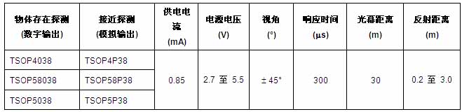 具有数字和模拟输出的TSOP4038、TSOP58038和TSOP5038红外传感器采用固定增益,从而解决了这些问题。通过固定增益,探测阈值和最终的探测距离都是固定的。一旦发射器亮度、接收器前的孔径、发射器和探测器的排列等光学参数确定下来,传感器在所有光照条件下都将具有稳定、可重复的性能。