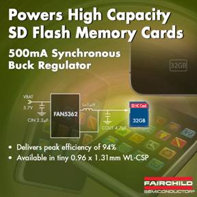 2010-07-09 17:05:11 本站原创由于移动电话和其它便携设备对存储功能的要求增加,出现了为更大容量的SD闪存卡供电的新兴需求。因此,飞兆半导体公司 (Fairchild Semiconductor)开发出一款采用专有的同步整流架构的3MHz 500mA同步降压转换器产品FAN5362,是需要支持大容量(如8、16、32GB等) SD闪存卡的手机设计人员的理想选择。