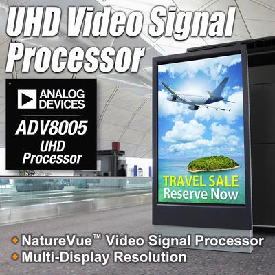 2014-01-08 10:43:57 21世纪经济报道北京2014年1月8日电 /美通社/ -- Analog Devices, Inc.(NASDAQ:ADI)最近推出一款超高清(UHD)视频信号处理器,这款处理器可以在SD (480i)、ED (480p)、HD(720p、1080i和1080p)以及UHD (2160p)等视频格式之间进行上下转换。UHD NatureVue™ ADV8005视频信号处理器可为两个同步视频流提供多种屏幕分辨率,适用范围十分广泛,从A/V接收器和HDMI分频器到商业视频分发系统和数字标牌。这款新型处理器可以在内部产生高质量的位图式屏幕显示(OSD),允许设计师轻松集成滚动文本和动画等功能,色深最高可达24位真彩色。同时还可接受来自外部源(如图形处理装置)的OSD信息。