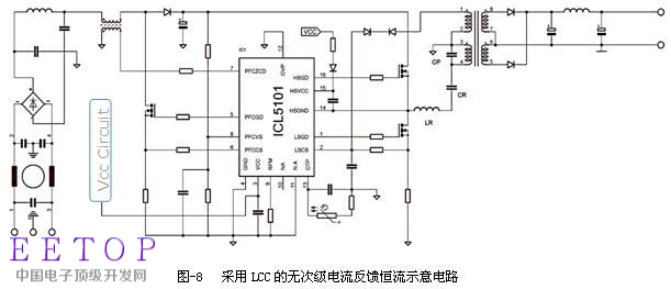 图-8是省略次级电流采样反馈的示意电路,工作在固定频率,整体电路更加精简,整机成本可以与"PFC+反激"拓扑竞争。考虑到效率等因素,整体成本甚至更低。