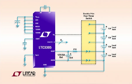 Linear推出单片、独立多节电池平衡器 LTC3305,该器件适用于 12V 铅酸电池。平衡是通过以下方式实现的:从电压较高的电池吸取电荷,并将这些电荷传送到电压较低的电池,以使电池充电至相同电量。这些电荷是用一个容量较低的电池传送的,该电池依次连接电池组上的电池。这个电池不仅传送电荷,该电池中的能量也加到电池组的总能量中,从而增加了容量。该芯片还包括排序、面向外部高压 NFET 的驱动电路、电压监视和保护功能。LTC3305 为独立工作而设计,不需要微处理器或其他控制电路。有了 LTC3305,就可以更换电池组的电池,而且新更换的电池还能与电池组的其他原有电池快速平衡。LTC3305 非常适合电信备份系统、家用电池供电备份系统、电动汽车和工业照明系统等应用。