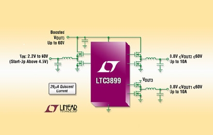Linear推出三输出 (降压、降压、升压) 29μA 静态电流、同步 DC/DC 控制器 LTC3899,该器件在 2.2V 至 60V 输入范围内保持输出电压稳定。12V 汽车电池在引擎重新启动或冷车发动时可能降至低于 4V,从而导致信息娱乐系统以及其他采用 5V 或更高电压工作的电子系统复位。升压型转换器为两个降压型转换器供电,从而在汽车电池电压下降时避免了输出电压下降,在怠速时关闭引擎以节省燃料的汽车启/停系统中,这是一种非常有用的功能。60V 最高输入电压涵盖双电池卡车应用。或者,降压型控制器可由输入供电以用作通用的三路输出控制器。
