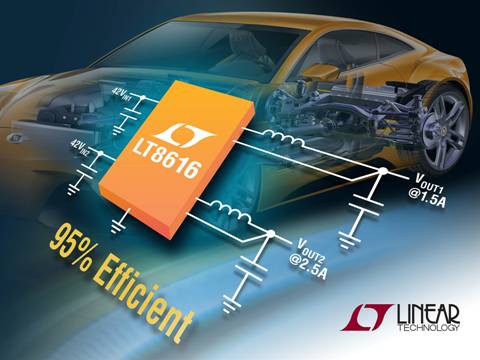 LT8616 的 35ns 最短接通时间实现了 16VIN 至 1.8VOUT 的降压型转换,而 2MHz 开关有助设计师避开关键噪声敏感频段 (例如 AM 收音机),同时使解决方案的占板面积非常紧凑。该器件 3.4V 至 42V 的输入电压范围使其非常适合汽车应用,这类应用必须在最低输入电压低至 3.4V 的冷车发动和停-启情况下以及在超过 40V 的负载突降瞬态时保持稳定。在所有情况下,LT8616 的每个通道均保持仅为 400mV (在 1A) 的最低压差电压,从而使该器件能够在汽车冷车发动等情况下表现出色。LT8616 的 28 引线耐热增强型 TSSOP 封装和高开关频率允许使用很小的外部电感器和电容器,可构成占板面积紧凑和高热效率的解决方案。