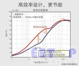 利用ROHM擅长的模拟设计技术优势,在80V级的DC/DC转换器中实现了业界最高的功率转换效率。与一般产品相比,功率效率最大可提高19%、稳定运行时也可提高1.5%(按振荡频率300kHz、电源电压48V、输出电压5V设定时)的电力效率,有助于实现工业设备的节能化。