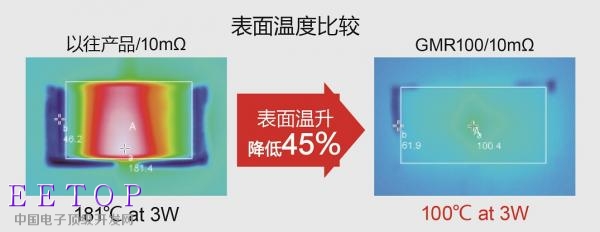 低阻分流值电阻器在大功率条件下使用时,存在热破坏的风险。针对该课题,ROHM通过改进材料并采用独有结构,大大降低了产品的表面温度。例如,在3W条件下使用10mΩ的产品时,以往产品温升达181℃,而GMR100产品仅为100℃,成功降低45%。