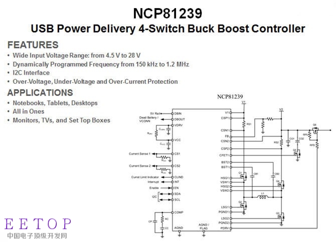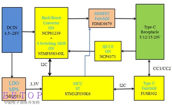 FUSB302,经由I2C接口与MCU连接。QC3.0快充协议则采用安森美的QC3.0 控制IC NCP4371连接USB接口的D+/D-讯号。MCU负责识别、判断负载充电需求与控制升降压电源转换芯片,以输出负载所需的电源规格。