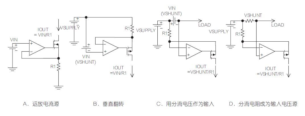 本文介绍的基于运放的电流检测电路并不新鲜,它的应用已有些时日,但关于电路本身的讨论却比较少。在相关应用中它被非正式地命名为“电流驱动”电路,所以我们也沿用这一名称。我们先来探究其基本概念。它是一个运算放大器及MOSFET电流源(注意,也可以使用双极晶体管,但是基极电流会导致1%左右的误差)。图1A显示了一个基本的运算放大器电流源电路。把它垂直翻转,就可以做高侧电流检测(如图1B所示),在图1C中重新绘制,显示我们将如何使用分流电压作为输入电压,图1D是最终的电路。