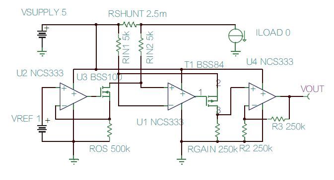· 运放必须是轨对轨输入,或者有一个包括正供电轨的共模电压范围。零漂移运算放大器可实现最小偏移量。但请记住,即使使用零漂移轨对轨运放,在较高的共模范围内运行通常不利于实现最低偏移。