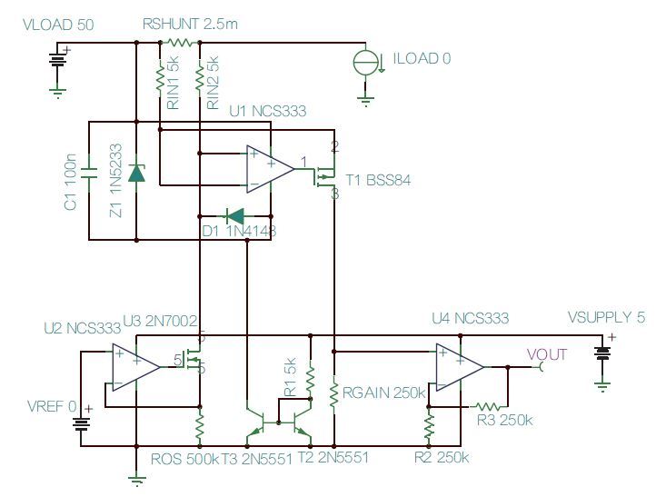 浮动电路包括在放大器两端增加齐纳二极管Z1,并为它提供接地的偏置电流源。齐纳偏压可像电阻一样简单,但是我喜欢电流镜技术,因为它提高了电路承受负载电压变化的能力。这样做时,我们已创建了一个运放的电源“窗口”,在负载电压下浮动。