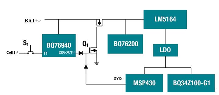 。该100 V LM5164是一款宽输入、低静态电流降压DC-DC转换器,可保护系统免受标称48 V电池的潜在瞬态影响,并为3.3 V微控制器(MCU)和BQ34Z100-G1供电。LM5164的输入由两个信号控制:来自BQ76940的REGOUT和来自MSP430™ MCU的SYS。这两个信号中的任何一个均为高电平,将导通Q1并启用LM5164的输入 - 从而启用MCU
