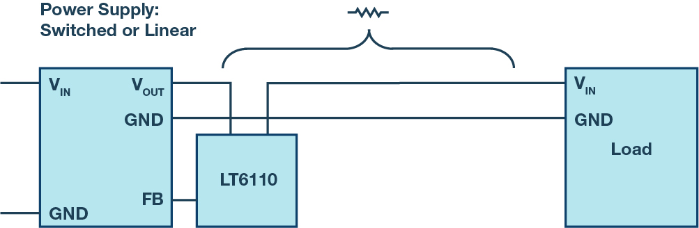 图 2.利用 LT6110 调节电源输出电压,以补偿连接线上的电压降