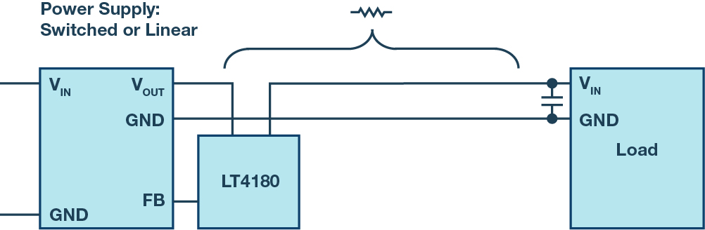 如果在器件工作期间线路电阻可能会发生变化,可使用LT4180 这类元件,在负载侧具有输入电容时,通过交流信号对连接线电阻进行虚拟预测,从而为负载端提供高精度电压。