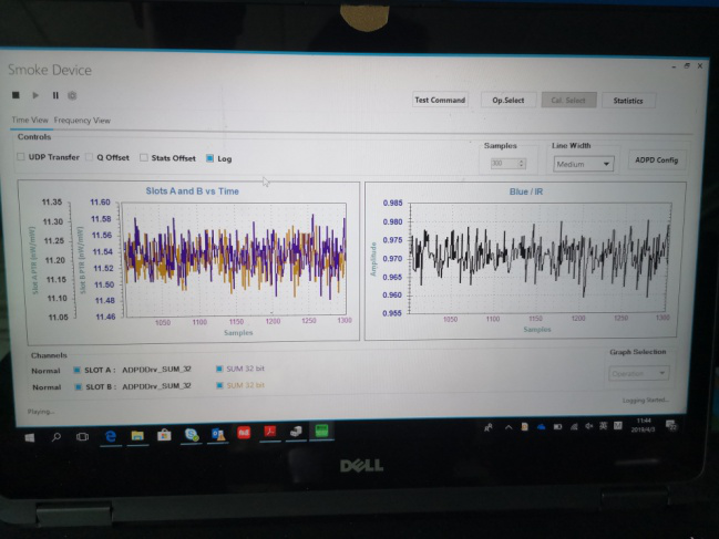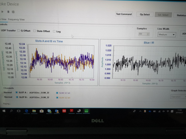图一、图三和图五是 ADPD188BI 评估板显示的采样值和蓝光与红外光的 PTR(接收光与发射光功率的比值) 比值。图中SlotA 表示蓝光的 PTR值,SlotB 表示红外光的 PTR 值, 这样做的目的是可以最大程度的减小噪声干扰对结果的影响。
