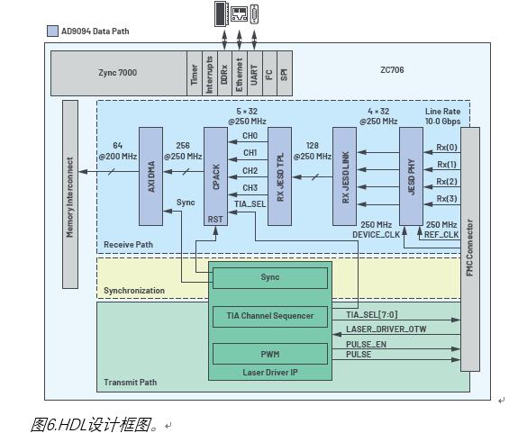 HDL设计包含连接硬件的主要接口,其逻辑电路实现了将来自JESD链接的数据传输至系统存储器,驱动激光器,同步接收器和发射器以准确