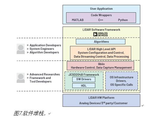 虽然libiio提供低层编程接口,但在大多数情况下,用户期望使用平台相关的集合了低层驱动器调用的API,来展示一组功能,用于访问和配置各种系统参数和流数据。因此,LIDAR原型制作平台采用特定的API,以及适用于常用框架和编程语言(例如C/C++、MATLAB®或Python®)的配套组件,6使用户能够使用其首选的编程语言与系统连接,集中精力研发对客户而言极具价值的算法和应用。