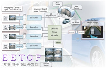 “通过33ms超高速处理,来自4枚摄像头的影像信号即使在高速行驶中也能实时地显示在驾驶席的监视器上,可以像看镜子那样直观地对车辆周围状况进行安全确认。”David介绍道,“目前这套方案已经量产,我们还将推出下一代方案,基于Miranda,将提出ADAS叠加,增强图像处理能力。”他同时指出,过去一些全景视觉系统长时间观看会造成眩晕感,图像有明显的变形,以及测距不准等问题,目前在该公司的最新解决方案中都已经完全解决。